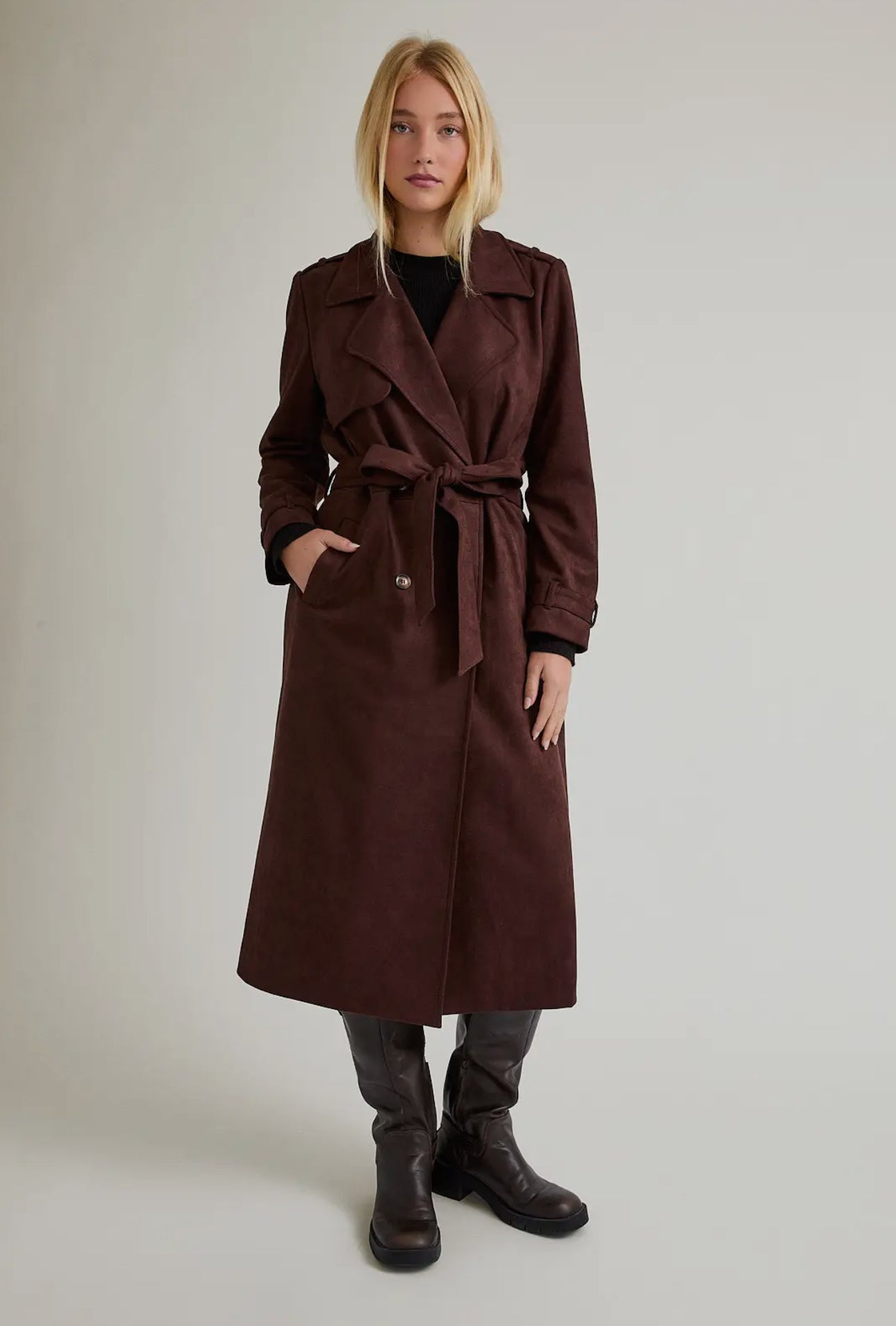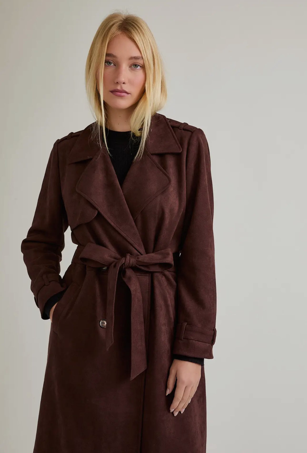 Make a statement with the Serena Suede Trench Coat, crafted in sumptuous chocolate brown suede that commands attention. This contemporary classic works overtime in your closet—throw it over your favorite jeans for an instantly polished look, or cinch it over a dress for date night glamour. The extended length and refined silhouette deliver the modern edge and sophistication you're looking for, making it the investment piece that elevates every ensemble.