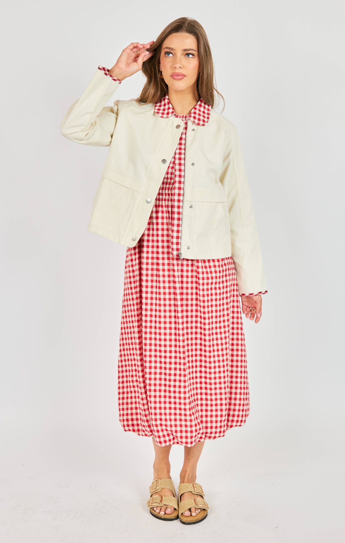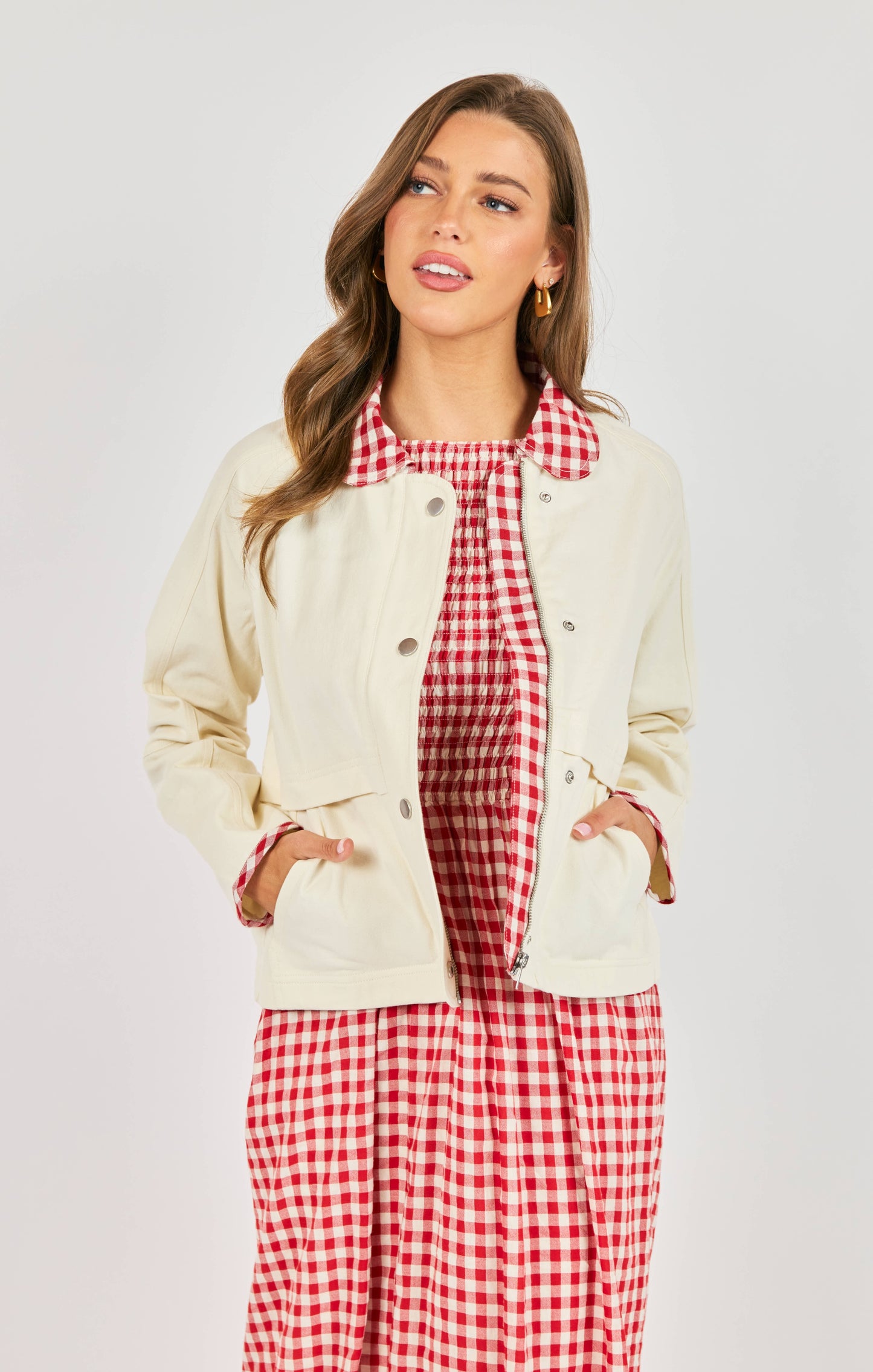 Elevate your everyday style with this charming ivory barn jacket, where classic meets contemporary. The standout feature—a striking red and ivory gingham collar—adds a playful pop of personality, while matching contrast piping along the sleeves creates a polished, coordinated look. Perfect for layering over your favorite pieces, this versatile jacket transitions seamlessly from casual outings to weekend adventures. The thoughtful design details make it an instant wardrobe favorite that pairs beautifully with denim, dresses, or anything in between.