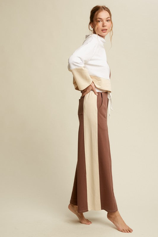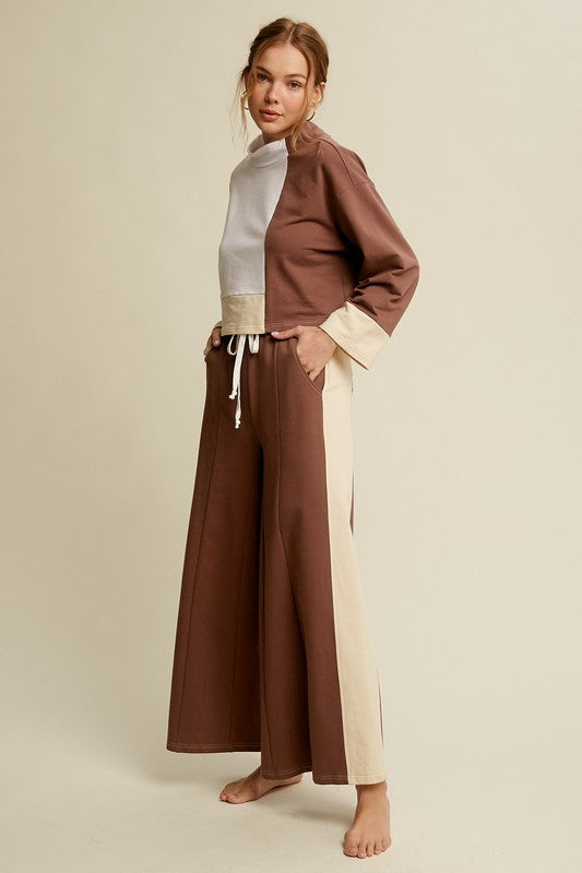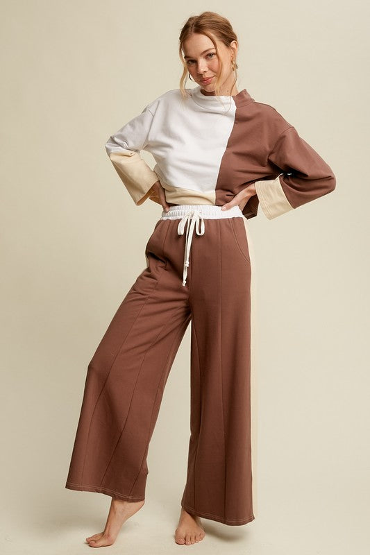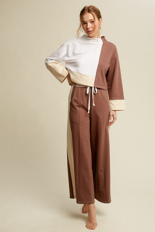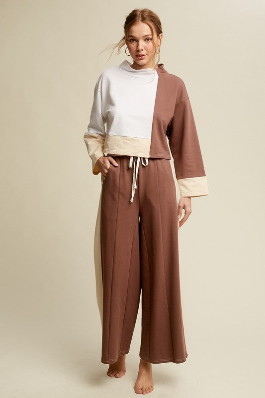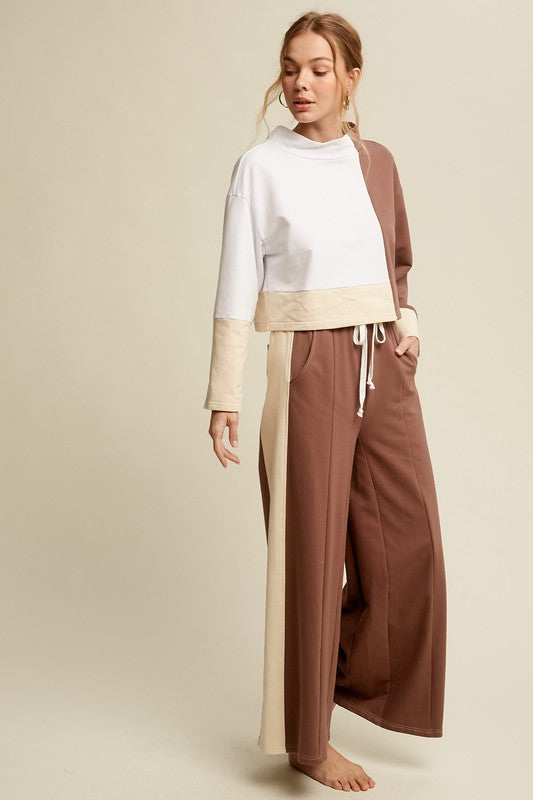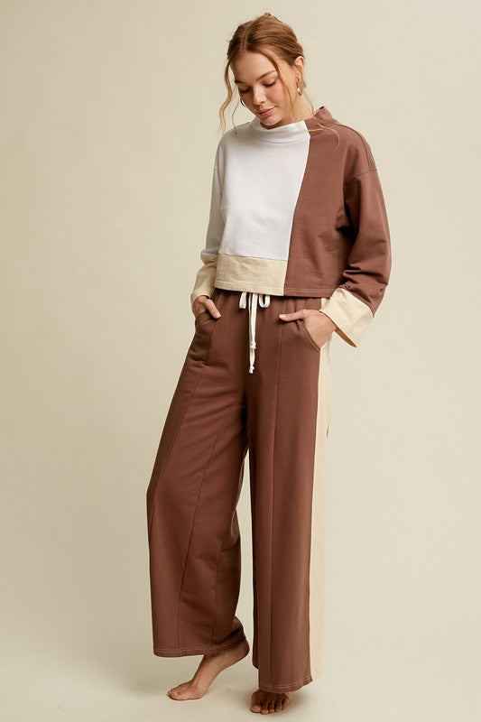 Elevate your lounge game with the Arlet Color Block Lounge Set. The knit top features a wide mock neckline and wide opening sleeves for a sophisticated look. The matching pants boast color block detailing and a comfortable elastic waistband. This set exudes elegance and exclusivity, perfect for the fashion-forward individual.