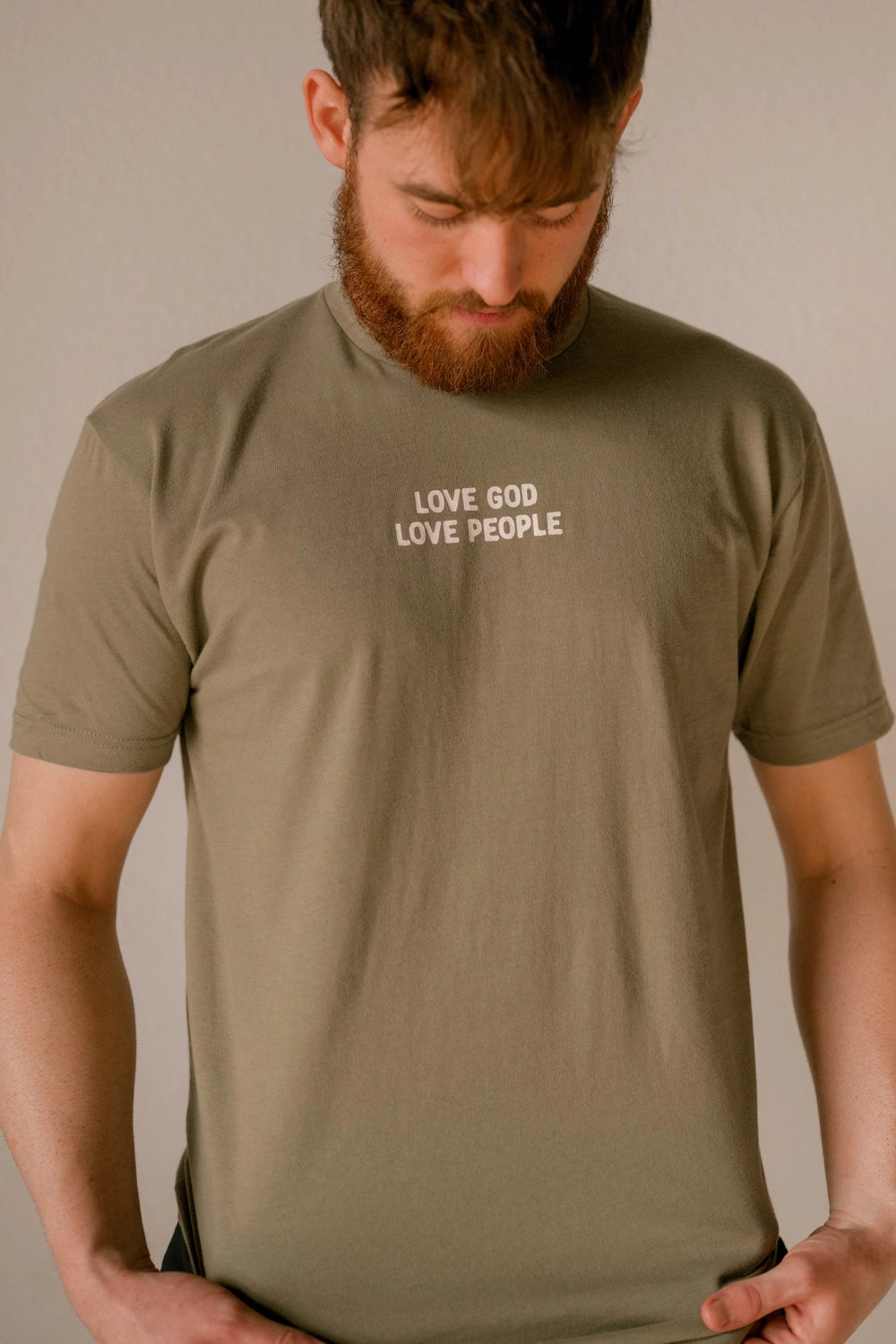 When we are following Jesus, love isn’t a suggestion, it’s a command. First, He calls us to love God with all of our heart, soul, mind, and strength. Second, He tells us to love others as He first loved us. He says that love is what we will be recognized by as His disciples. This isn’t always easy and doesn’t always come naturally, but He has given us a perfect example to follow. Our fleshly tendency is to love with expectations, where Jesus calls us to love unconditionally. We tend to only want to love others when they deserve it, but we were loved even when we least deserved it. Live out His command to love. It will transform your life and the lives of those around you. Love the Lord your God with all your heart and with all your soul and with all your strength. - Deuteronomy 6:5 A new command I give you: Love one another. As I have loved you, so you must love one another. By this everyone will know that you are my disciples, if you love one another. - John 13:34-35 Unisex Fit Light Olive Tee with Cream Ink 100% combed ring-spun cotton Set-in 1x1 rib collar Hemmed sleeves Screen printed in Texas