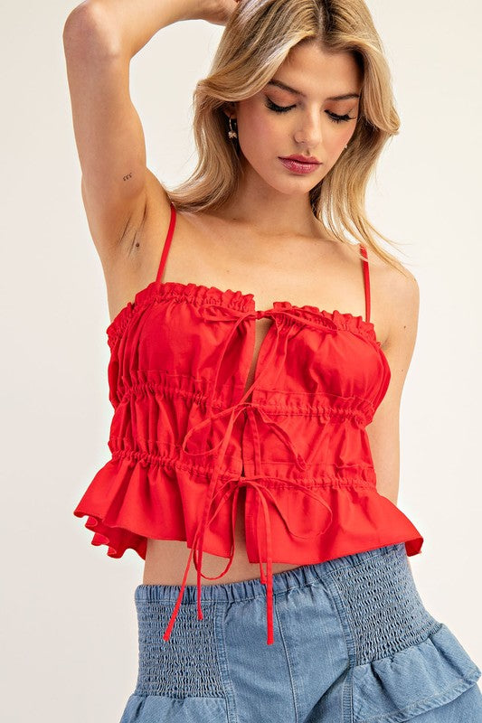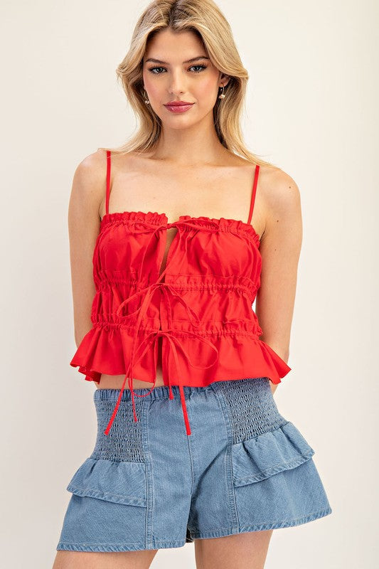 Indulge in the sophistication of the Luna Tiered Ruffle Top. This sleeveless blouse boasts intricate ruching, adjustable straps, and feminine ties that effortlessly elevate any outfit. With its delicate design and elegant features, this top is a must-have for any stylish wardrobe.